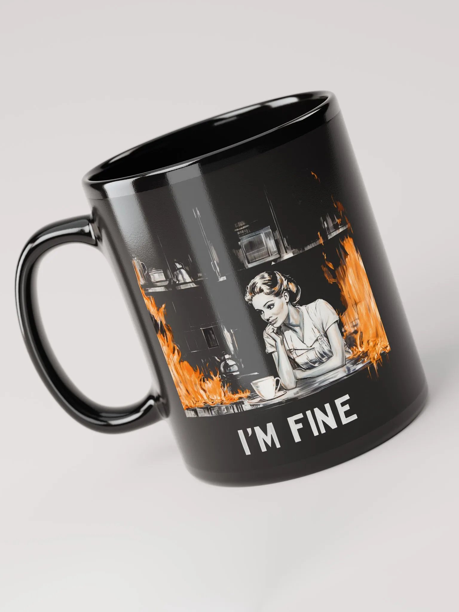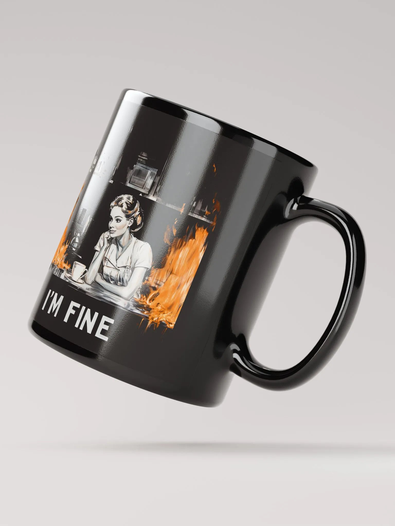 Sip, smile, and pretend everything's under control. This vibrant mug features a 1950s-style poster art design of a poised lady enjoying her coffee, seemingly unfazed by the blazing kitchen in the background. The tongue-in-cheek caption “I’m Fine” adds a touch of classic humor to the eye-catching illustration. This one-of-a-kind mug is perfect for those who find solace in their daily cuppa, even on the most chaotic days. Its unique blend of vintage aesthetics and modern wit makes it a standout addition to any coffee lover's collection.